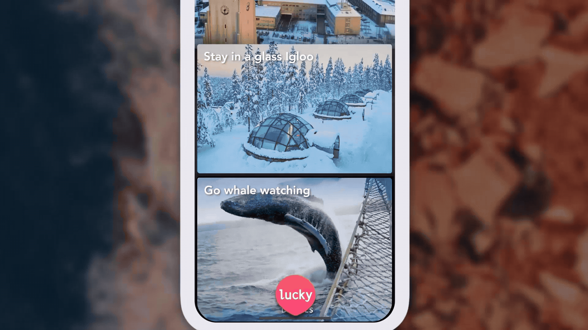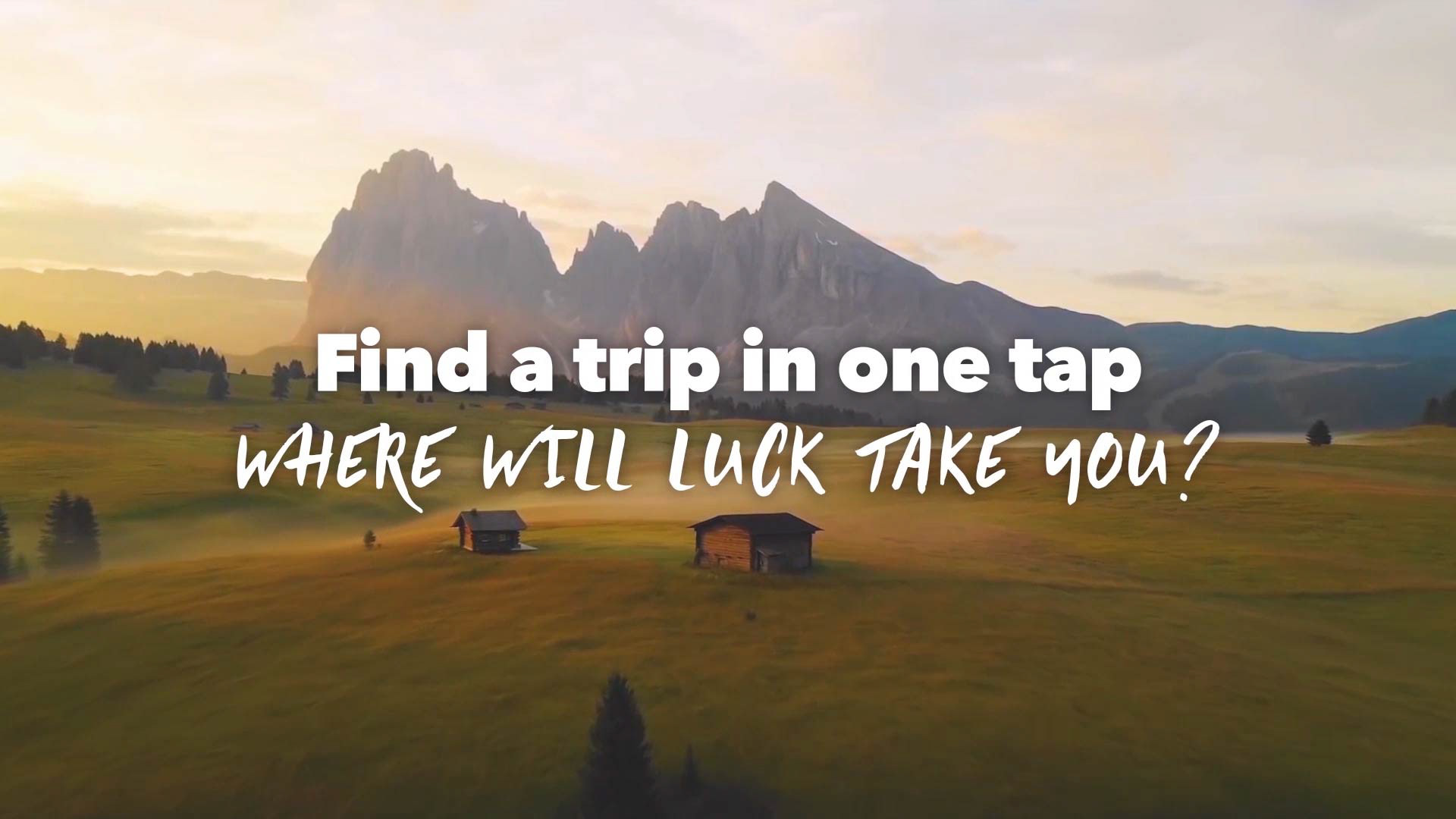 Advertisement video for LuckyTrip, a mobile app that lets users discover complete trips at the tap of a button. Highlights the ease and fun of exploring new destinations